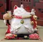 最有特色的地方当属其身上独具匠心的装饰图案和配饰了,猫猫除了本来人性化的表情外,身上还勾勒着很多有象征意义的图案,譬如,宝船寓意财富;翔鹰是梦想的象征;龟鹤象征着长寿;松竹梅是吉祥的代名词;还有象征着富贵的四季花卉等等图案,流畅而纤细的笔触,惟妙惟肖,在光洁的陶瓷和绚彩的釉面间,无不传神地刻画出招财猫的乖巧和灵气。配饰则包括了宝槌、葫芦、鲤鱼等都是蕴涵了美好愿望的饰物,拿在手里让人有种盈润而温煦的感觉。所以,您还要根据这些图案所代表的含义不同来购买您喜欢的招财猫。 |
