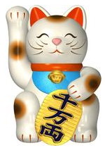 在这么不景气的气氛下,也有制造者将招财猫和其他的开运幸运物结合,最常见的就是与七福神结合了。 与七福神结合後的招财猫,在外观上摆脱了可爱的模样,开运、招财的气势、声势更壮观、更华丽,听说也会尽快的达到招财进福的效果。 6. 今户烧招财猫 位于东京台东区的今户区,是十五世纪中旬今户烧素陶瓷器的起源。 东京台东区今户的「今户神社」,拜殿前就有两只巨大的招财猫,御祭神是日本神话中建国之祖的伊奘诺尊与配偶女神伊奘冉尊。院内有两只招财猫连结在一起的「结缘猫」,有斑块的代表男神,纯白的 代表女神,是良缘护符。 这两只猫举的是右手。通常,举右手是表示 能招来财富,举左手是表示能招来客人。传说中,浅草有位养了一只老猫的老婆婆,因为老伴过世,经济拮据 ,只好投靠亲戚家。老婆婆撒泪与老猫诀别後,当天夜晚做了一个梦。 梦中,老猫告诉婆婆说,如果制作一座它的偶像,必定会福德自来 。老婆婆听从老猫的托梦,将猫偶像供奉在神龛上,朝晚合掌叩拜。之後,果然如老猫所说,喜报接二连三,老婆婆也不用再寄人篱下了。後来,老婆婆因猫偶像而致富的传言,马上遍及左邻右舍,每天都有人来向她借猫偶像。于是老婆婆便托窑户制作陶器招财猫,并在浅草开了一家专门出售今户烧招财猫的商店。而当时今户烧招财猫在浅草一带炙手可热,生意也是非常的兴隆。 传说里,薄云的沉香木招财猫,举的是左手。所以老婆婆制作的招财猫,为了与薄云的沉香木招财猫能有所区别,故意将猫洗脸的手,改为右手。 7、隅田川的金猫银猫 江户时代中期,隅田川(墨田区)的两国一带,有一家生意非常兴隆 妓院,店门搁置著一只银漆猫。 後来有人仿效银猫妓院,毗邻开了一 家金猫妓院,店门搁置著一只金漆猫,生意也一样门庭若市。银猫妓院的院主,却流连于赌场中,最後竟然将家财输得一乾二净。于是命令自己的老婆阿纲,以色相诓骗常客的吴服店(和服店)掌柜八兵卫。 没想到阿纲竟日久生情,真心爱上了八兵卫。 这种不伦之恋是怎么也无法终成眷属的情况下,于是两人决意殉情而死。于是,两人在银猫妓院内各自留下一封遗书殉情。 这一殉情事件当然轰动了整个江户,被写成净琉璃剧本(日本传统音乐中的一种道白剧,江户时代时演变成偶人净琉璃剧),还被搬上舞台,并且非常卖座。据说,花柳界摆饰招财猫的源头,便是这桩殉情事件,而妓院往往在门前放置一座大型金银「招来猫」,以招来客人。因此,有些书中就用「招来猫」替代「妓院」一词。 短尾猫由来据资料记载,日本短尾猫最初是由中国在至少1000多年前传入日本的。从它们的形象出现于一些早在11世纪时的工艺品中可见,日本短尾猫已经存在了一段非常长的时间。 在日本短尾猫传入日本的初期,只有贵族及皇室人员才可以饲养它们。当时这种猫被认为会带来好运及幸福而倍受尊崇。后来至1605年,由于日本有着非常严重的鼠患,以至下令全国的猫儿都加入猎杀行列,至此这种日本短尾猫才从皇宫走入普通大众之中,成为日本家庭的家猫。而在1968年,一个名叫Elizabeth Feeret的繁殖者首次把日本短尾猫带到美国,并开始有系统地繁育。至1971年,CFA正式给予日本短尾猫一个标准,并在5年后接受它为参展猫。至于长毛种的日本短尾猫则在1993年才被CFA承认。 招财猫的形态拥有兔子般的尾巴,日本短尾猫名副其实是种尾巴十分短的猫种,完全伸直后约长2-4口寸约5cm-10cm,在多数情况下尾巴都是卷曲的,就像兔子尾巴一样,而且每只日本短尾猫的尾巴也是不同的。至于为什么它的尾巴特别短,主要是由于受到隐性遗传因子正染色体基因的影响所致。 关于招财猫的来历有很多种说法,不同的说法成就了当今日本招财猫不同的流派,如吉原的招财猫、北海道的招财猫,爱知县的招财猫和越后屋的招财猫等。招财猫的手势是有讲究的,先说左右手之别,举左手招福,是女猫;举右手招财,是公猫。身体的颜色又分好几种,如果粉色就是希望恋爱顺利,红色是身体健康,绿色是希望能金榜题名,金色是财运亨通,黄色是业务繁荣,黑色则是避邪保平安。招财猫身上的图案主要有以下几种:象征着财富的宝船图案,象征着理想和梦想的茄子、鹰和富士山的图案,象征着长寿的龟鹤图案,象征着吉祥的松竹梅图案,象征着富贵的四季花卉等。招财猫的配饰包括万宝槌、葫芦、达摩祖师等。招财猫的制品主要包括:存钱罐、各种摆件挂件、居家用品(茶具、器皿、餐具、装饰画)等。 流派招财猫虽然起源于日本,但是也有着类似于中国的“猫洗面过耳则客来”的民间说法,要表达的依旧是人类亘古不变的对幸福的希冀,也成就了不同流派的招财猫,它们手势和颜色都蕴涵了独特的文化内涵。 先说招财猫的左右手之别:举左手代表着招福,一般都是母猫;举右手代表招财,一般都是公猫。如果两只手都举起来了,却是招福又招财的好口彩。 招财猫胸前挂着的金铃代表开运、招财、招福、缘起的意思。 另外,不同颜色的招财猫也代表了不同的意义:白猫代表幸运;黑猫能辟邪消灾,保平安。粉色代表希望恋爱顺利的意思;红色代表身体健康的意思;绿色代表希望能金榜题名的意思;金色代表财运亨通;黄色代表是业务繁荣;黑色则代表保平安和避邪之意;紫色代表美丽、健康、长寿的意思;蓝色代表事业有成。 |