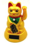 招财猫举起左手,意思是以便招福;部份是举起右手,意思是以便招财。若用两只招财猫, 一左一右,这样,「财」和「福」便能一起到达了。还有,也可以由招财猫所举起的左右手里,分辨它们的雌雄,东京的豪德寺里,举右手的雄猫有招财、招福之意,西方寺里薄云大夫举起左手的「玉」是雌猫,有招呼客人之意。而招财猫胸前挂著的金铃,也有开运、招财、招福、 缘起的意思。招财猫的手势是有讲究的,先说左右手之别,举左手招福,是女猫;举右手招财,是公猫。身体的颜色又分好几种,如果粉色就是希望恋爱顺利,红色是身体健康,绿色是希望能金榜题名,金色是财运亨通,黄色是业务繁荣,黑色则是避邪保平安。招财猫身上的图案主要有以下几种:象征着财富的宝船图案,象征着理想和梦想的茄子、鹰和富士山的图案,象征着长寿的龟鹤图案,象征着吉祥的松竹梅图案,象征着富贵的四季花卉等。